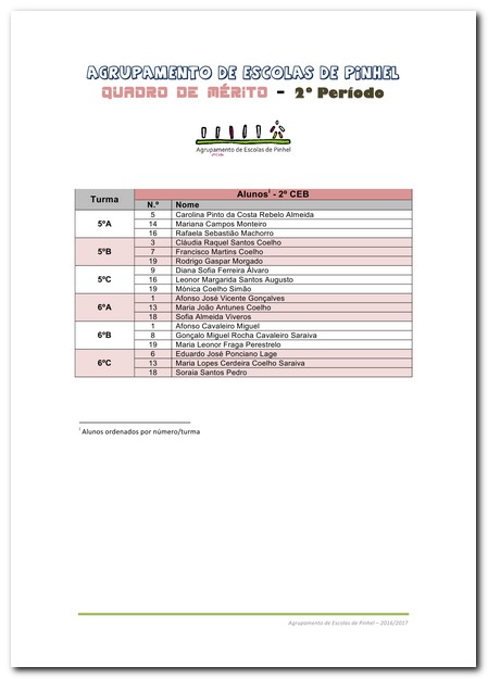 No seguimento da iniciativa, criada em 2012/2013 por esta Direção do Agrupamento de Escolas, aqui publicamos o Quadro de Mérito referente ao 2º Período do ano letivo 2016/2017 que pretende "realçar" os melhores alunos de cada turma por período em cada ano letivo.