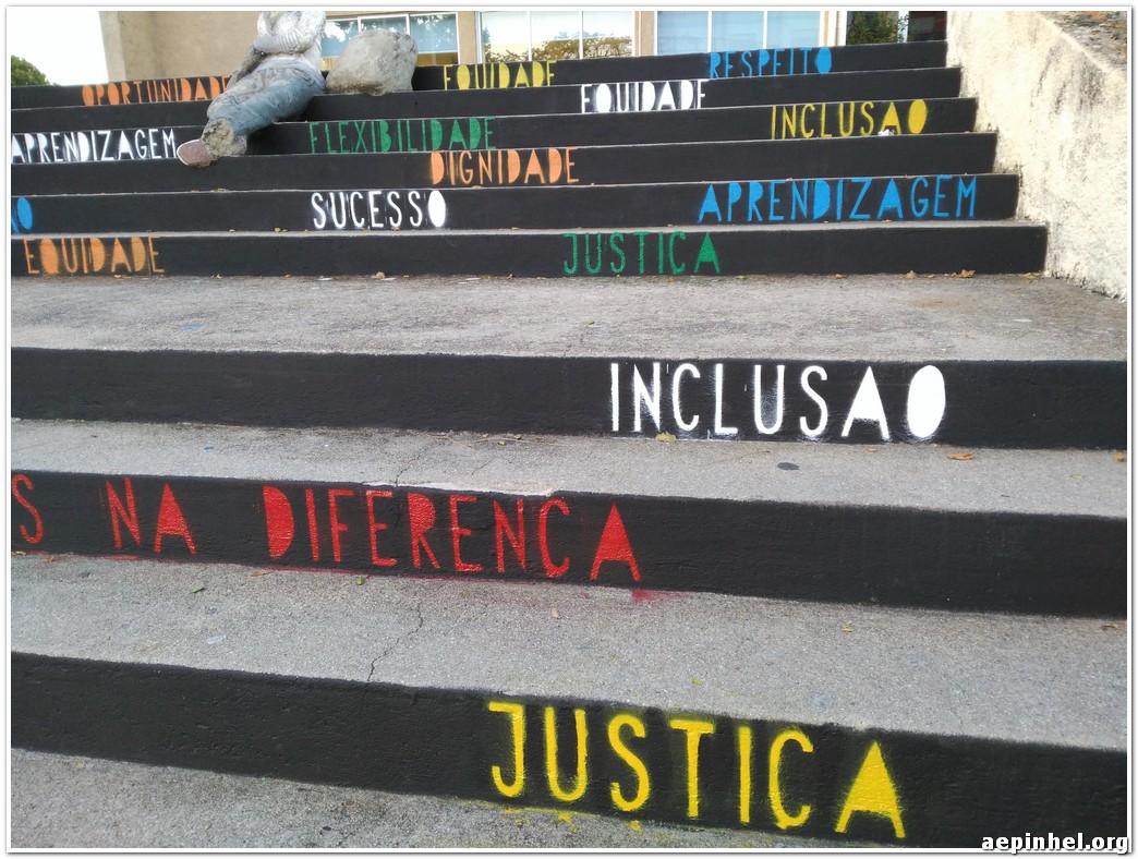 Durante a semana de 27 a 30 de novembro, para assinalar o Dia Internacional das Pessoas com Deficiência – 3 de dezembro – tendo como objetivo principal sensibilizar toda a comunidade, além do trabalho realizado nas turmas pelos diversos docentes, os professores de Educação Especial, em articulação com os colegas de Artes e respetivos alunos, procederam à pintura de palavras e frases nas escadas do edifício principal da escola sede. Deste modo, quem passa na rua ou se desloque à escola, pode observar o trabalho realizado relacionado com esta problemática.